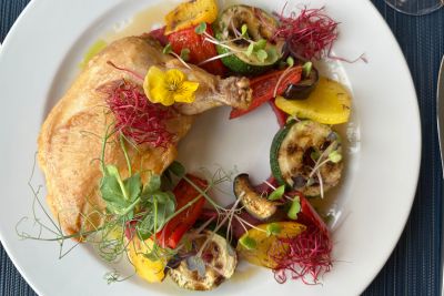 fehérborban párolt csirkecomb, zöldségekkel